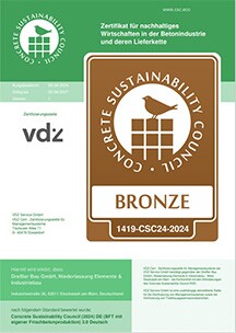 Eines unserer Ziele ist die Reduktion unseres CO2-Ausstoßes um –40 % CO2-Emissionen bis 2032 in den Kat. 1 und 2 nach DIN EN ISO 14064 an unseren Standorten. Zudem haben wir unsere Produktionsstätte für Architekturbeton und Betonfertigteile vom Concrete Sustainability Council (CSC) zertifizieren lassen.