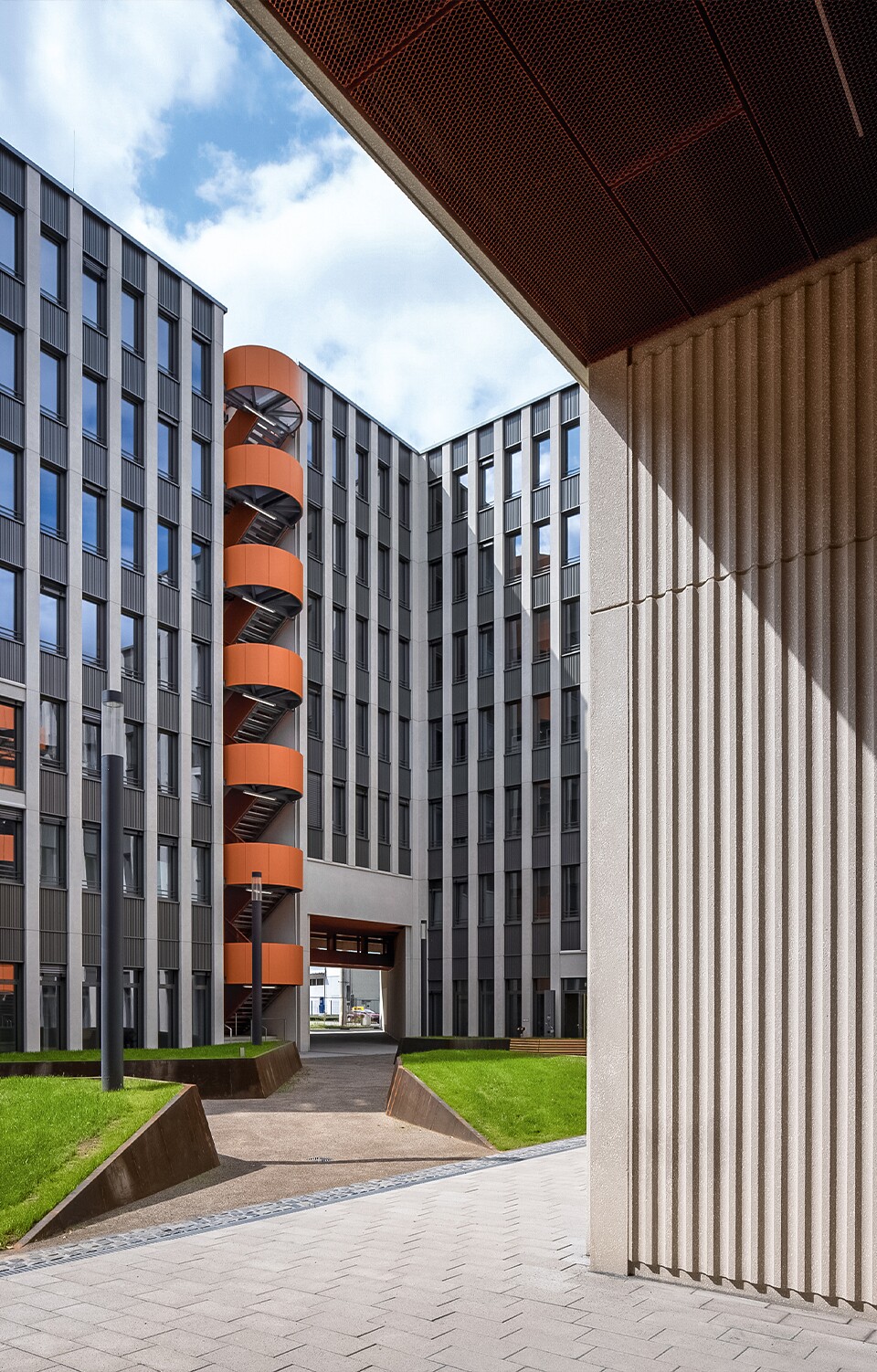 Mit rund 12.500 m² Bürofläche auf sieben Etagen setzt der Bürokomplex Mattes neue Maßstäbe für modernes Arbeiten. Der polygonale Bau fügt sich nahtlos in die Umgebung ein und bietet einen lärmgeschützten, sonnigen Innenhof. Besonders ins Auge fallen die orangefarbenen Außentreppen, die in Kombination mit Cortenstahl-Elementen und üppiger Begrünung ein eindrucksvolles Farbspiel schaffen. Die markante Fassade aus Betonfertigteilen und Aluminium verleiht dem Gebäude seinen unverwechselbaren Charakter. Drei großzügige, zweigeschossige Durchgänge führen in den Innenhof und beeindrucken durch Architekturbeton-Elemente mit einer außergewöhnlichen Wellenstruktur. Für die Fertigung dieser Elemente kamen speziell hergestellte Sondermatrizen zum Einsatz.