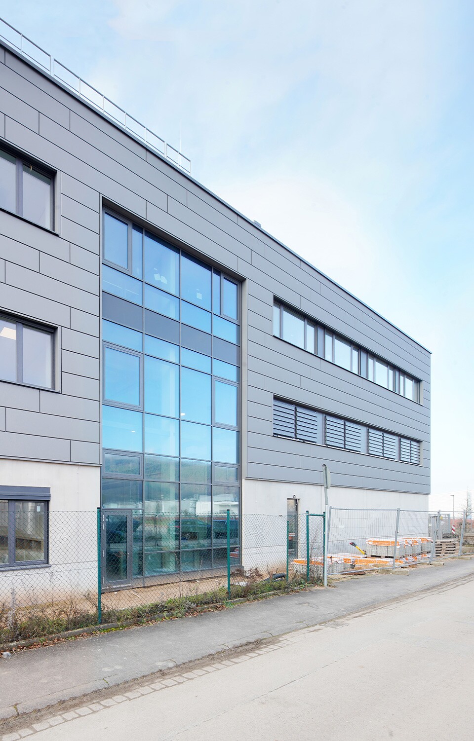 An der Ostseite schließt eine ca. 22 x 30 m große Lagerhalle an, ausgestattet mit einer Verschieberegalanlage für schwere Ersatzteile und einer maximalen Lagerguthöhe von 7,50 m. Die Zugänge erfolgen über zwei innenliegende Treppenhäuser sowie einen Außentreppenturm; ein Treppenhaus führt bis auf das Dach. Das Gebäude erfüllt die Anforderungen der KfW-Effizienzhausstufe 40+ .