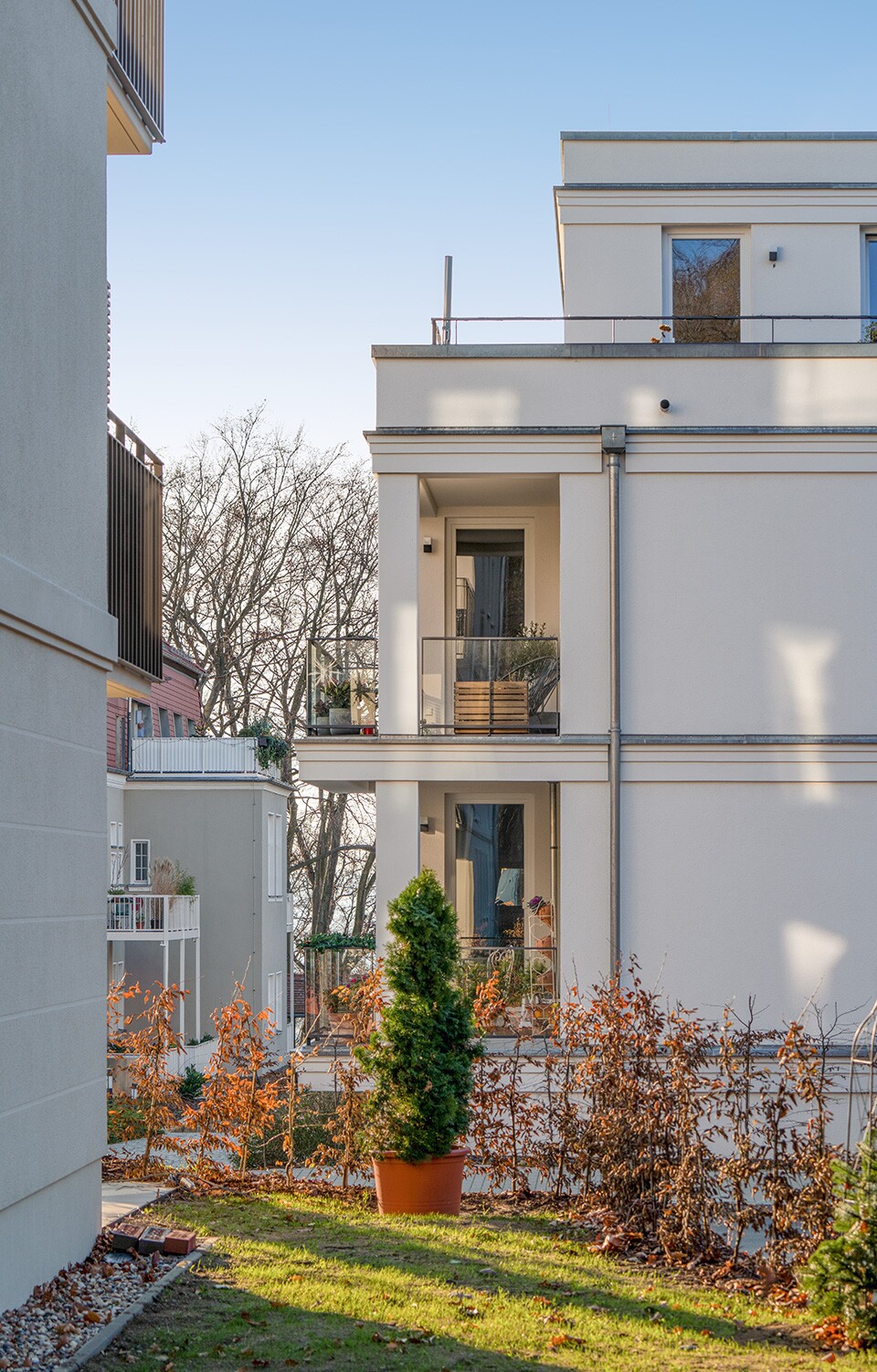 Auf dem Areal des früheren Weidner-Sanatoriums in Dresden-Wachwitz wurden im 3. Bauabschnitt zwei weitere Mehrfamilienhäuser mit insgesamt 44 Eigentumswohnungen und eine Tiefgarage mit 25 Stellplätzen errichtet. Bodentiefe große Fenster sorgen für lichtdurchflutete Räume. Tageslichtbäder und große Terrassen verbinden das Wohnen mit dem Park und führen zu einer eindrucksvollen Wohnphilosophie. Die Errichtung der Wohngebäude und der Tiefgarage erfolgte schlüsselfertig einschließlich der Ausführungsplanung. Die beiden Neubauten fügen sich harmonisch in die bereits bestehende Bebauung mit den Neubauten und den sanierten Altbauten ein und runden insgesamt das Ensemble am Wachwitzer Höhenpark ab.