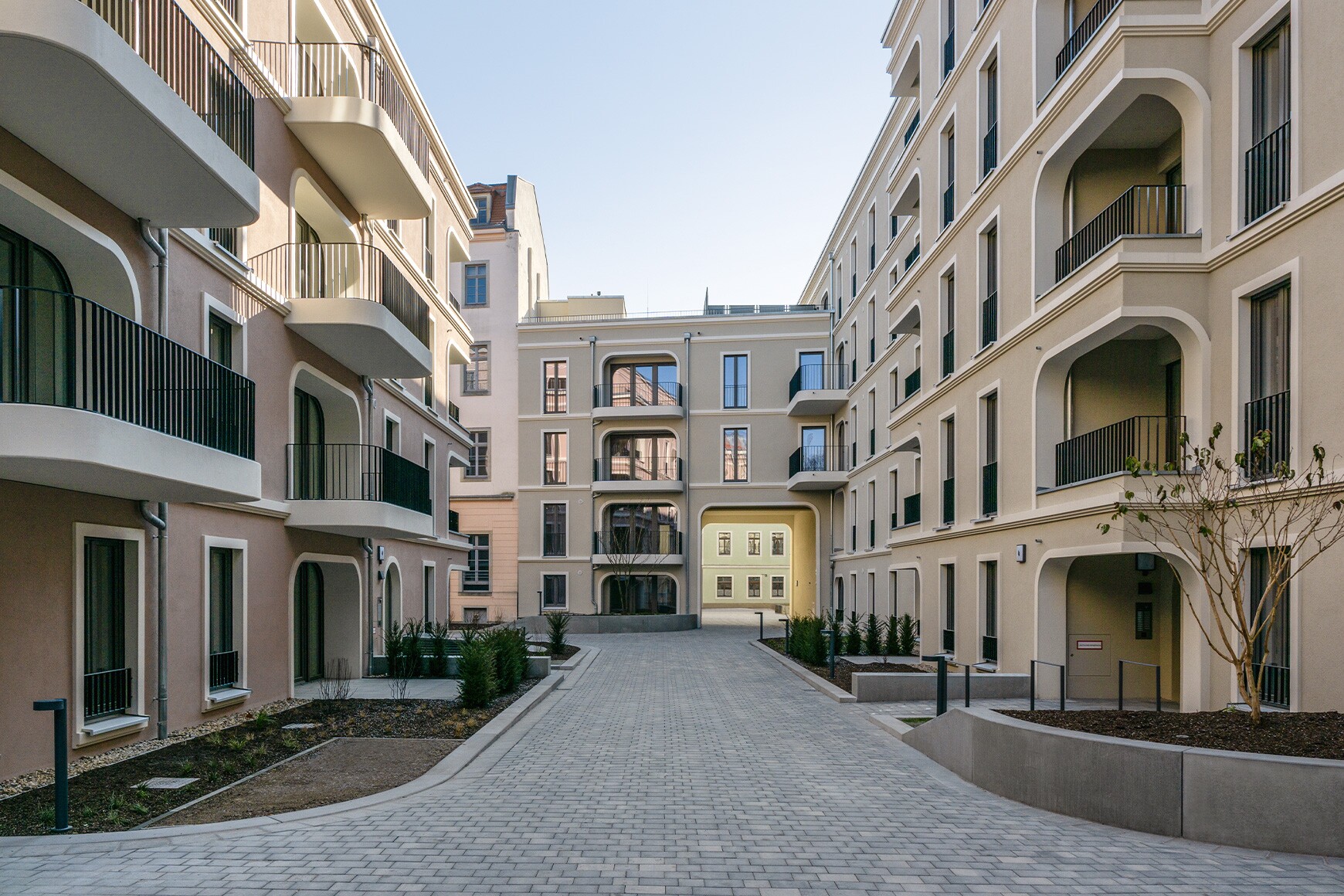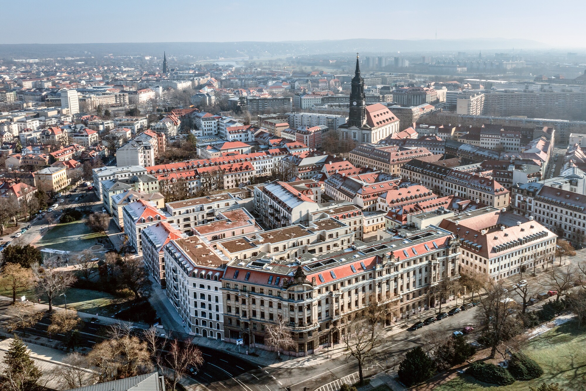 Die Königshöfe Dresden kombinieren moderne Bau prozesse, Materialien und Formgebung mit barocken Elementen. Trotz stellenweise fast 300 Jahren Altersunterschied fügen sie sich geradezu symbiotisch in die Nachbarbebauung ein. Zum Auftrag gehörte die schlüsselfertige Errichtung der 192 Wohnungen samt zweigeschossiger Tiefgarage.