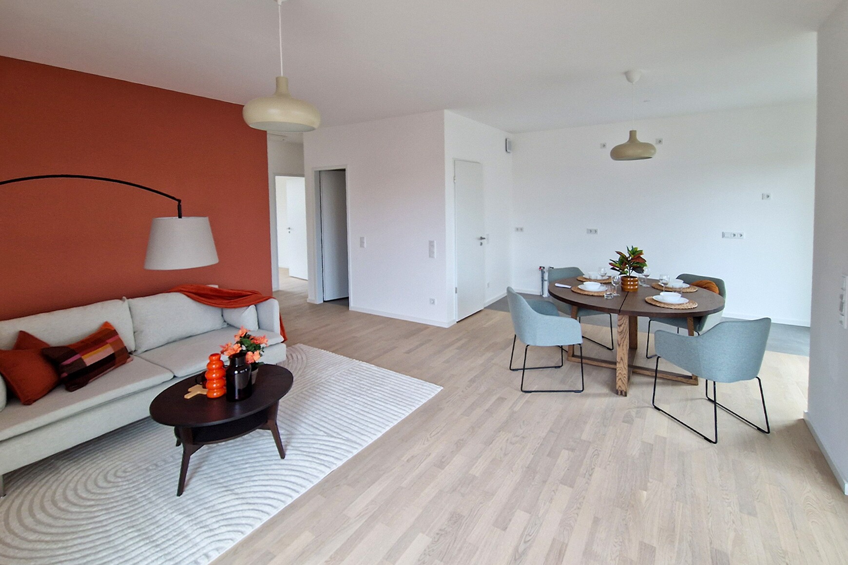 Auf dem ehemaligen Gelände der Hessenglasfabrik AG in Oberursel entsteht ein neues Wohn- und Gewerbequartier. Die Niederlassung Aschaffenburg errichtet dort bis Ende März 2026 zwei Wohngebäude mit je 18 Wohnungen in fünf Geschossen, verbunden durch eine gemeinsame Tiefgarage. In „Haus A“ entstehen 16 geförderte Wohnungen sowie zwei Eigentumswohnungen im Staffelgeschoss. Alle 18 Wohnungen in „Haus B“ sind Eigentumswohnungen, teilweise bereits während der Bauzeit verkauft. Die Grundrisse umfassen 2- bis 4-Zimmer-Wohnungen, teils mit zwei Bädern. Beide Gebäude werden im KfW‑55‑Standard mit Photovoltaikanlage ausgeführt. Die BGF liegt bei ca. 6.180 m²; die Wohnfläche bei ca. 2.130 m². Die Fassaden entstehen als WDVS-Konstruktion mit 3-fach-verglasten Kunststofffenstern. Die Belüftung erfolgt über Rollladen- bzw. Leibungslüfter, die Abluft über feuchtegesteuerte Elemente in Bädern und Küchen. Die Beheizung übernehmen Dachwärmepumpen, das Warmwasser wird zusätzlich über Booster-Wärmepumpen im Keller erhitzt. Alle haustechnischen Anlagen sind vollständig getrennt und auf die spätere Realteilung vorbereitet. Die gemeinsame Tiefgarage mit 35 Stellplätzen wurde in WU-Beton ausgeführt. Die nicht überbaute Garagendecke wird nach dem Schwammstadtprinzip als Retentionsfläche gestaltet, die Entwässerung erfolgt direkt in den Urselbach.