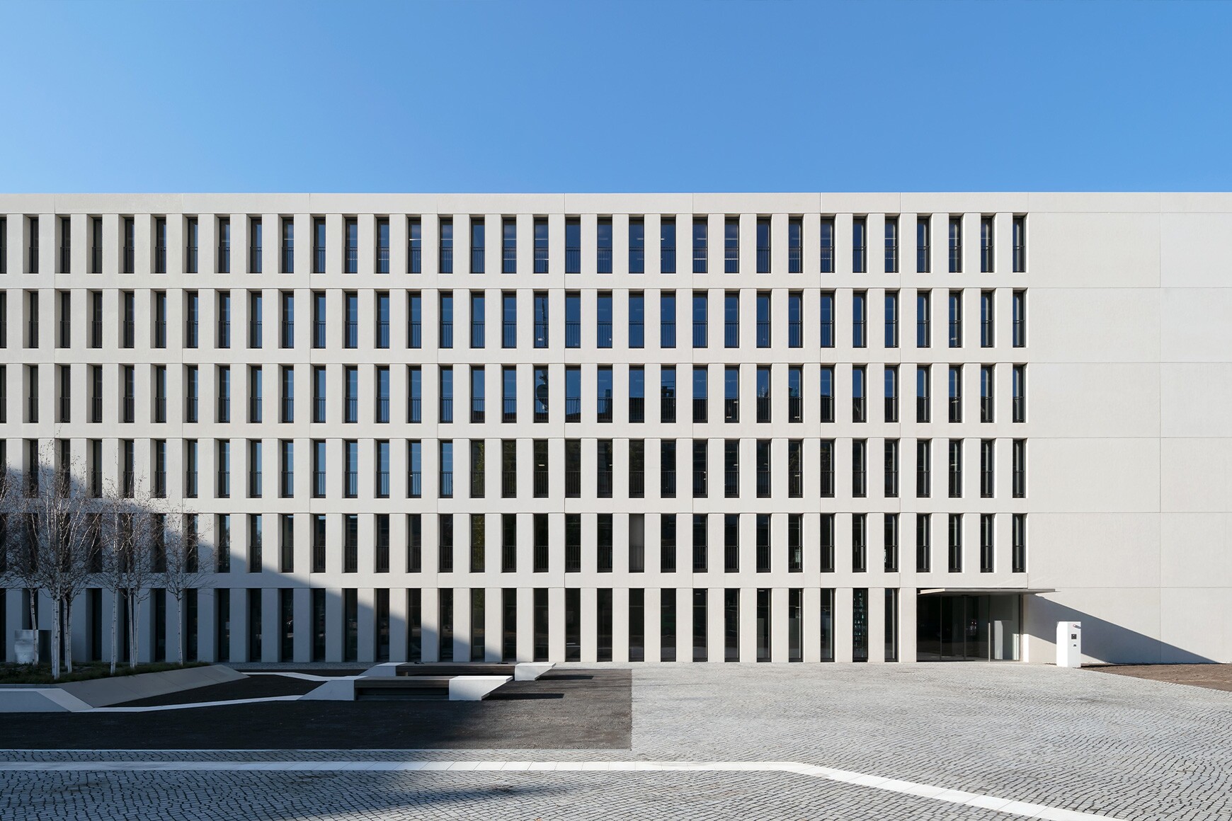 In direkter Nachbarschaft zum historischen Gebäudeensemble des Polizeipräsidiums steht der 6-stöckige quaderförmige Neubau des Karlsruher Finanzamtes. Mit seinem klar strukturierten, rhythmisierten Fassadenraster schufen Wittfoht Architekten einen in sich ruhenden Stadtbaustein. Seine plastische Profilierung erhält das Bauwerk durch die 38 cm tiefen Laibungen. Die Vorsatzschale der Sandwichelemente mit ihrer weißen, gestrahlten Oberfläche ist mit Glasfaserbewehrungsstäben an der Tragschale befestigt. Mit der thermisch nichtleitenden Verankerung und der 30 cm dicken Dämmung ist die Architekturbetonfassade mit einem Wärmedurchgangskoeffizienten von U ≤ 0,14 W/m²K auch für die Zukunft gut ausgerüstet. Mehr als 260 geschosshohe Sandwichstützen und -wände kamen zur Ausführung.