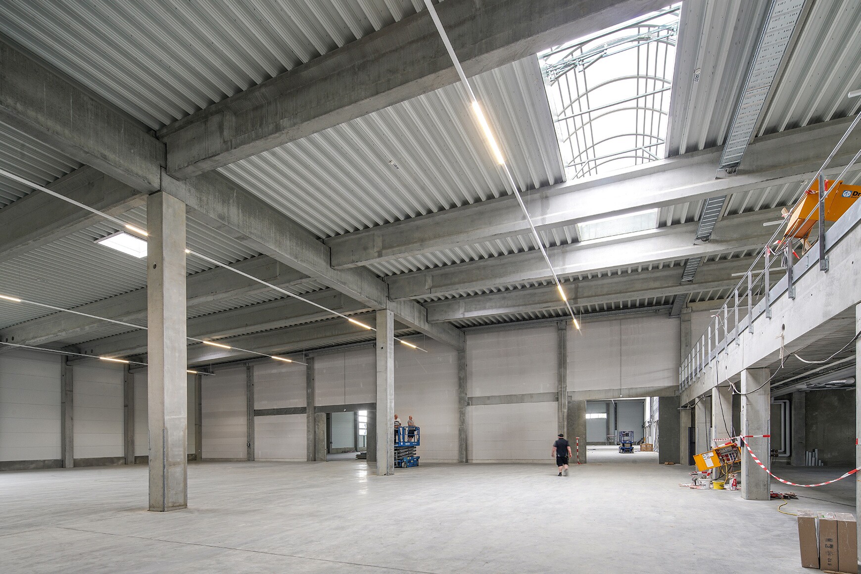 Realisierung als Generalunternehmer mit Planungsleistung ab der erweiterten Entwurfsphase inkl. Mieterbetreuung. Fertigung der Tragkonstruktion in unserem eigenen Fertigteilwerk in Stockstadt. Beseitigung von Altlasten aus Vorbebauung (Brandschaden); ca. 27.000 m² Grundstücksfläche Geländeausgleich „Cut&Fill“ im Maximum mit einem Höhenunterschied von bis zu 4 m; ca. 30.000 t Erdbewegung.