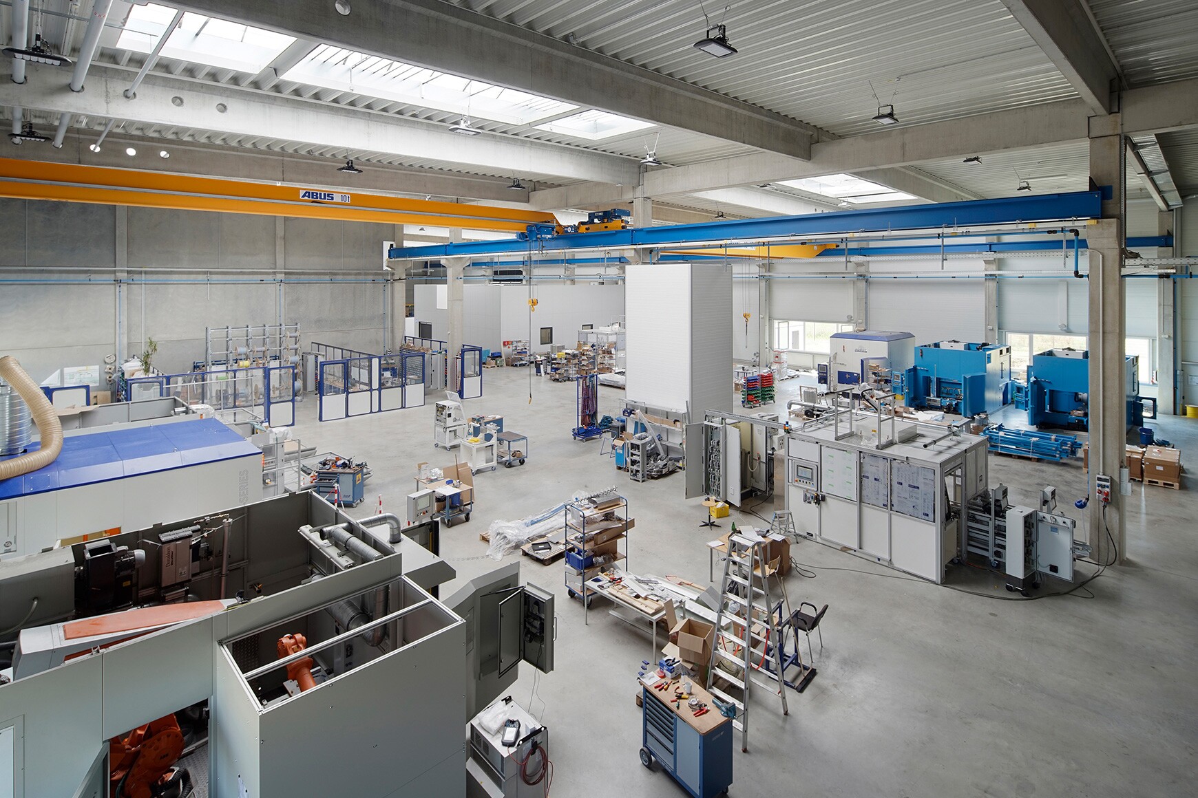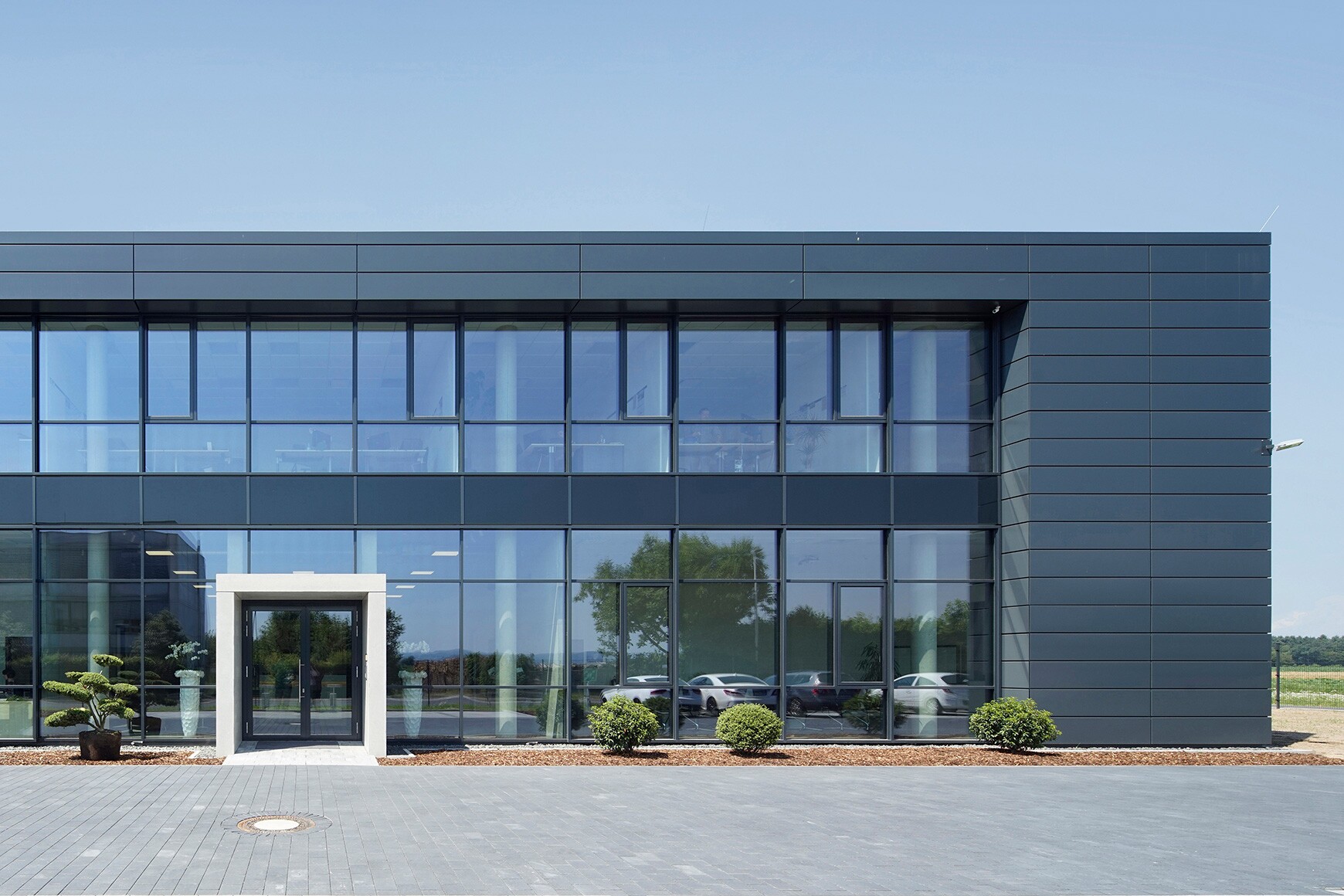 Schlüsselfertiger Neubau einer 3.000 m² großen und 10,50 m hohen Produktionshalle, bestehend aus einer Stahlbetonfertigteilkonstruktion. Das zweigeschossige Büro mit einer 550 m² großen Grundfläche ist durch eine Brandwand von der Halle getrennt. Der größte Teil der Bürofassade besteht aus einer verglasten Pfosten-Riegel-Konstruktion. Der CPT-Sonnenschutz von Schüco ermöglicht bei herabgelassenem Zustand eine fast ungehinderte Sicht nach außen. Die Betonaußenwand ist mit Wärmedämmung und horizontal verlegten anthrazitfarbenen Stahlkassetten belegt. Das Foliendach der Halle ist durch vier 12 m lange Lichtbänder durchbrochen, die für eine Tageslichtbeleuchtung der Halle sorgen. Das warme Wasser für die Heizung wird neben einem 220-kW-Brennwertkessel vorrangig von einem BHkW erwärmt, das zusätzlich noch 20 kW/h Strom erzeugt.