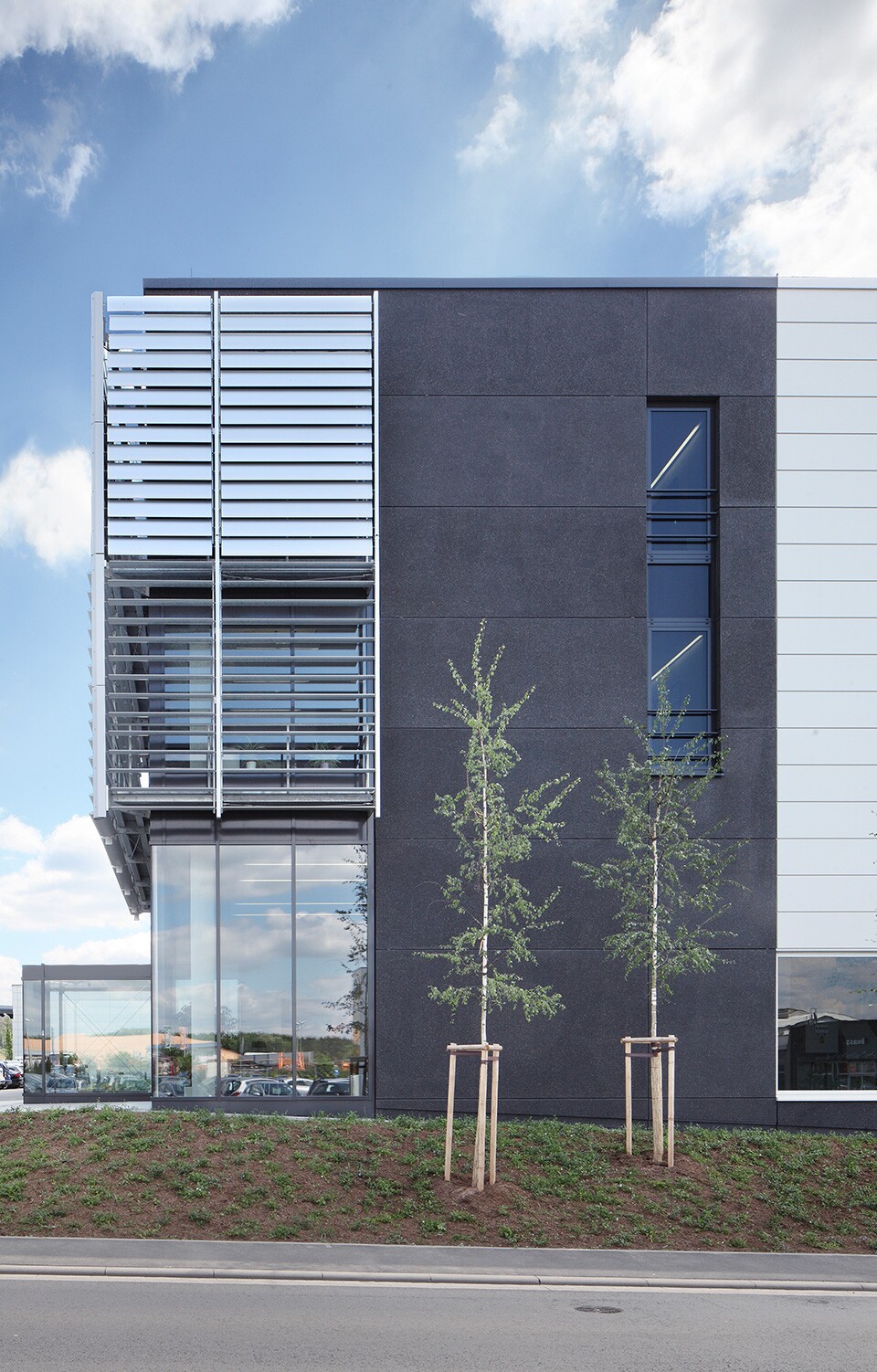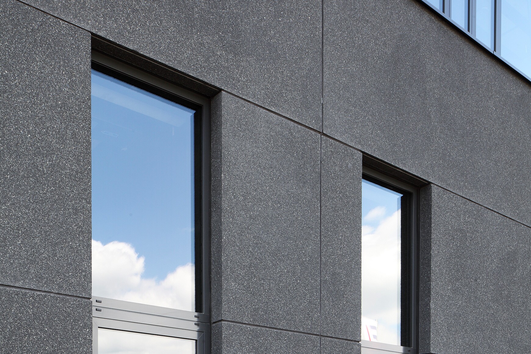 Besonders hervorzuheben ist die anspruchsvolle Fassadengestaltung des Bürogebäudes aus anthrazitfarbenem, gewaschenem Architekturbeton, die in unserem hauseigenen Fertigteilwerk konzipiert und gefertigt wurde.