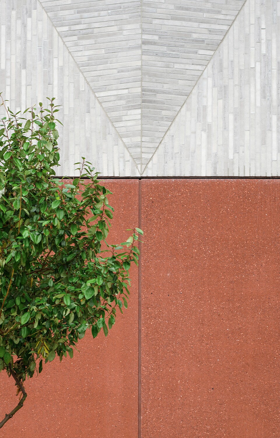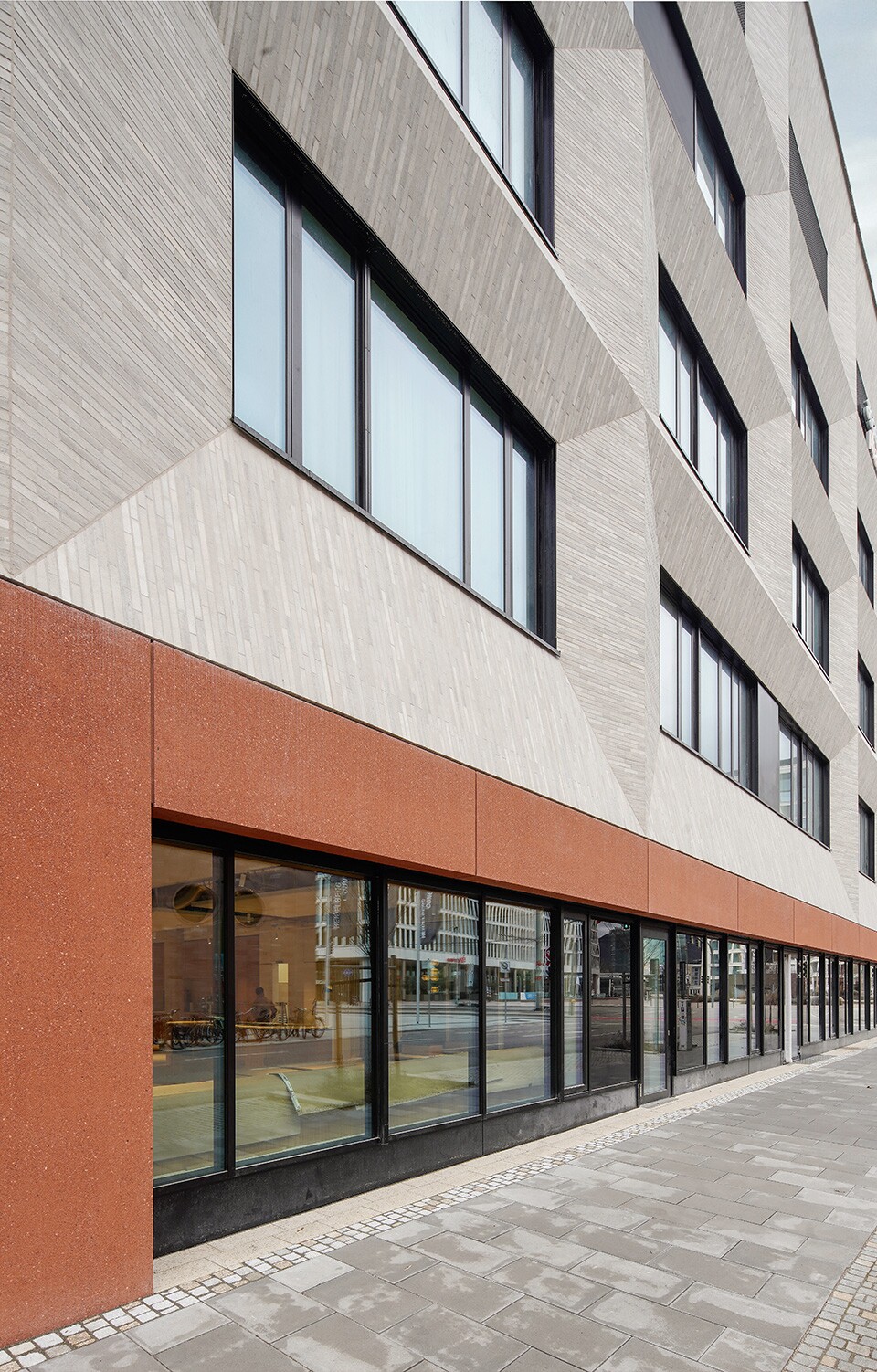 Die markante rote Betonfassade bildet den klaren Sockelbereich des Gebäudes und setzt zugleich einen gestalterischen Bezug zur regionalen Sandsteinarchitektur.