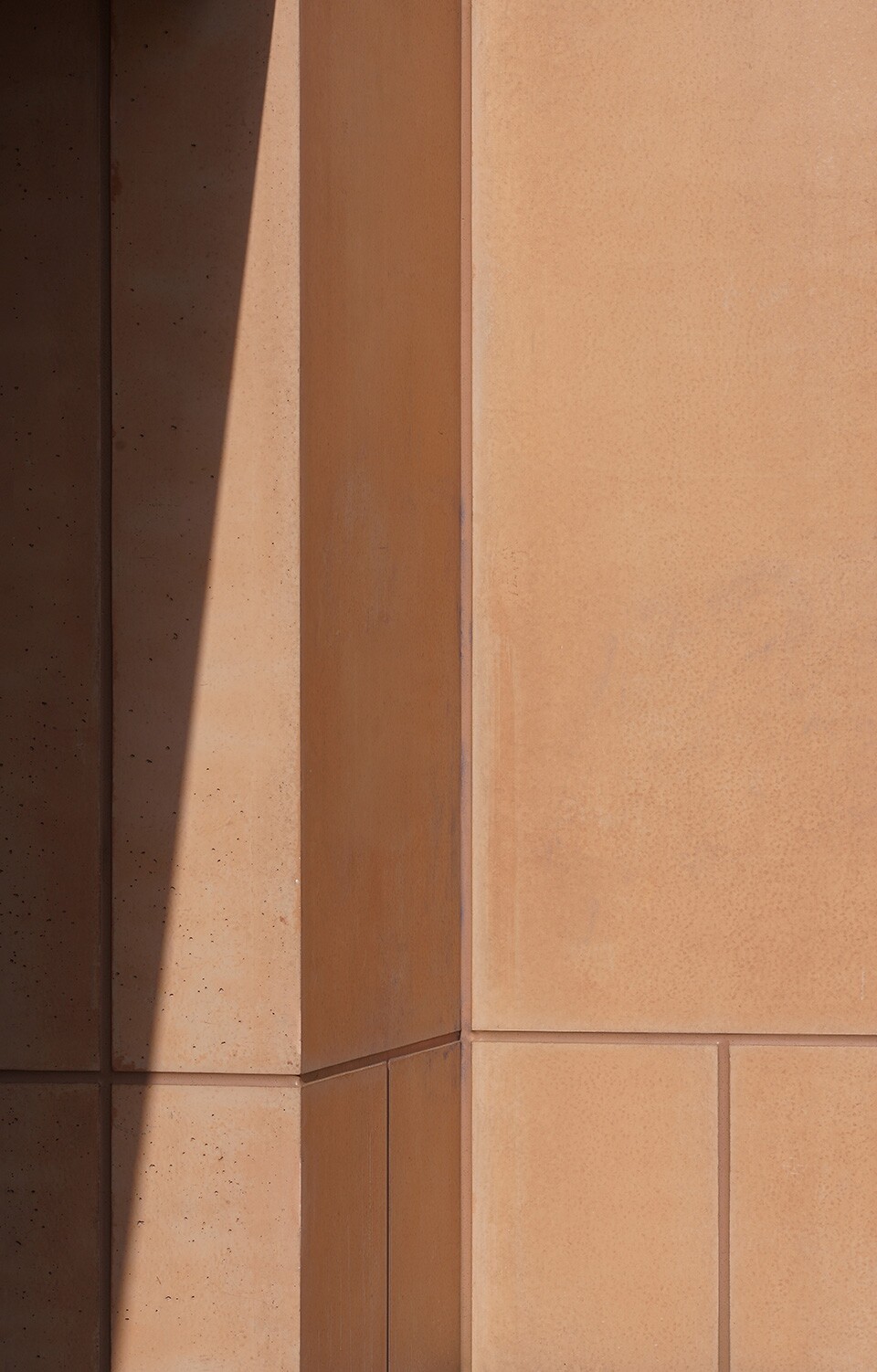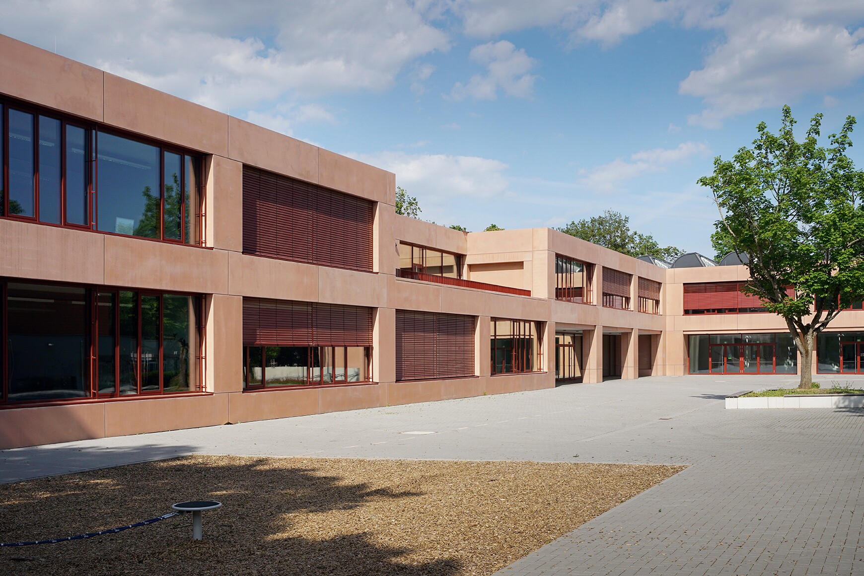 Der zweigeschossige, L-förmige Schulneubau liegt wie ein rötlichbrauner Monolith am nördlichen Ortsrand des Wiesbadener Vorortes Bierstadt. Er übernimmt gemäß seiner Vorbildwirkung und als Ort der Bewusstseinsbildung eine aktive Rolle im Bereich des Klimaschutzes und wird über die Lichthöfe und Atrien natürlich belichtet. Die großflächigen Fensterelemente werden von ca. 300 vorgehängten Betontafeln mit glatter Oberfläche und scharfkantiger Ausbildung umrahmt. Laibungen mit nahezu 40 cm Tiefe und Eckelemente mit 135 cm langen, angeformten Schenkeln unterstreichen die Massivität des Baukörpers.