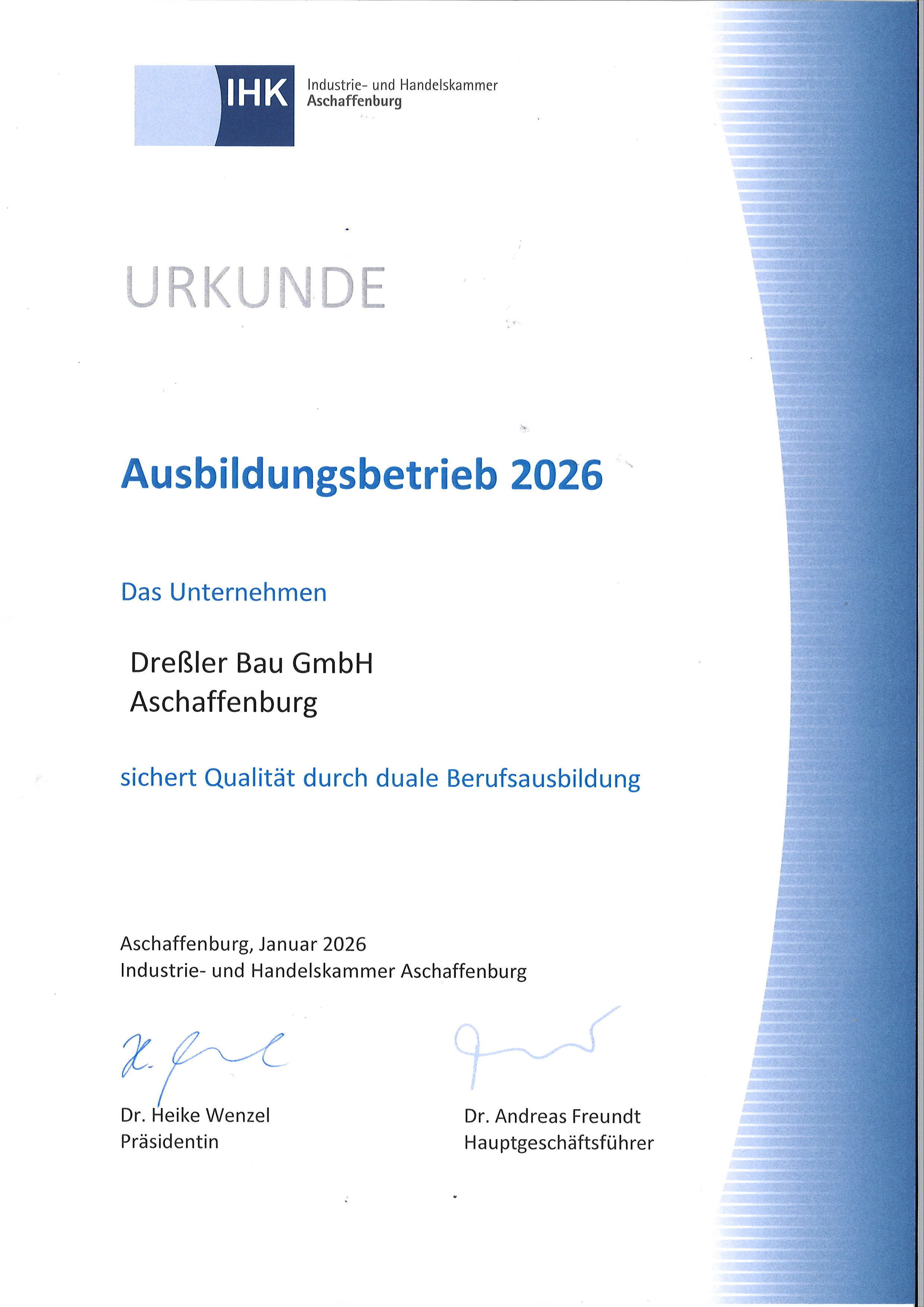 Der Dreßler Bau GmbH wurde durch die IHK Aschaffenburg das Prädikat „Ausbildungsbetrieb 2026“ verliehen.
