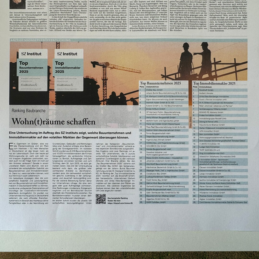 Die unabhängige, datenbasierte Analyse der Creditreform-Wirtschaftsdatenbank im Auftrag des SZ Instituts hat die wirtschaftlich leistungsfähigsten Unternehmen der Bau- und Immobilienbranche ermittelt. Dreßler Bau belegt den 1. Platz im Ranking der „Top Bauunternehmen 2025“.