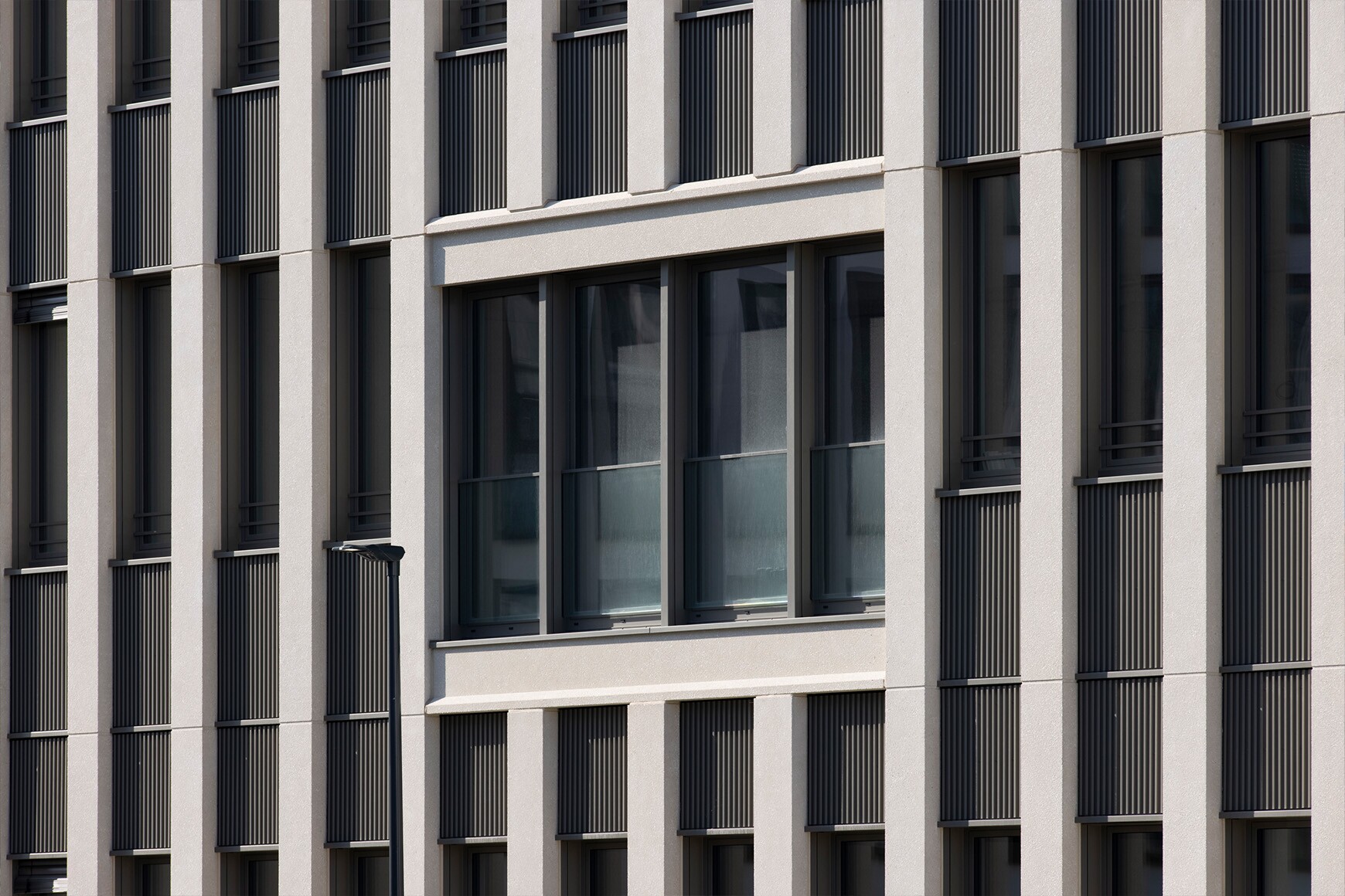 Dank präziser Montage und der Unterstützung eines digitalen Zwillings konnte dieses anspruchsvolle Projekt erfolgreich umgesetzt werden. Das Ergebnis: eine harmonische Verbindung aus innovativer Architektur und ingenieurtechnischer Expertise. Der Bürokomplex ist zudem mit dem DGNB-Gold-Zertifikat ausgezeichnet. Dreßler Bau produzierte und montierte 1.174 Fassadenelemente aus hellem Architekturbeton mit gestrahlter Oberfläche für das neue Vorzeigeprojekt.