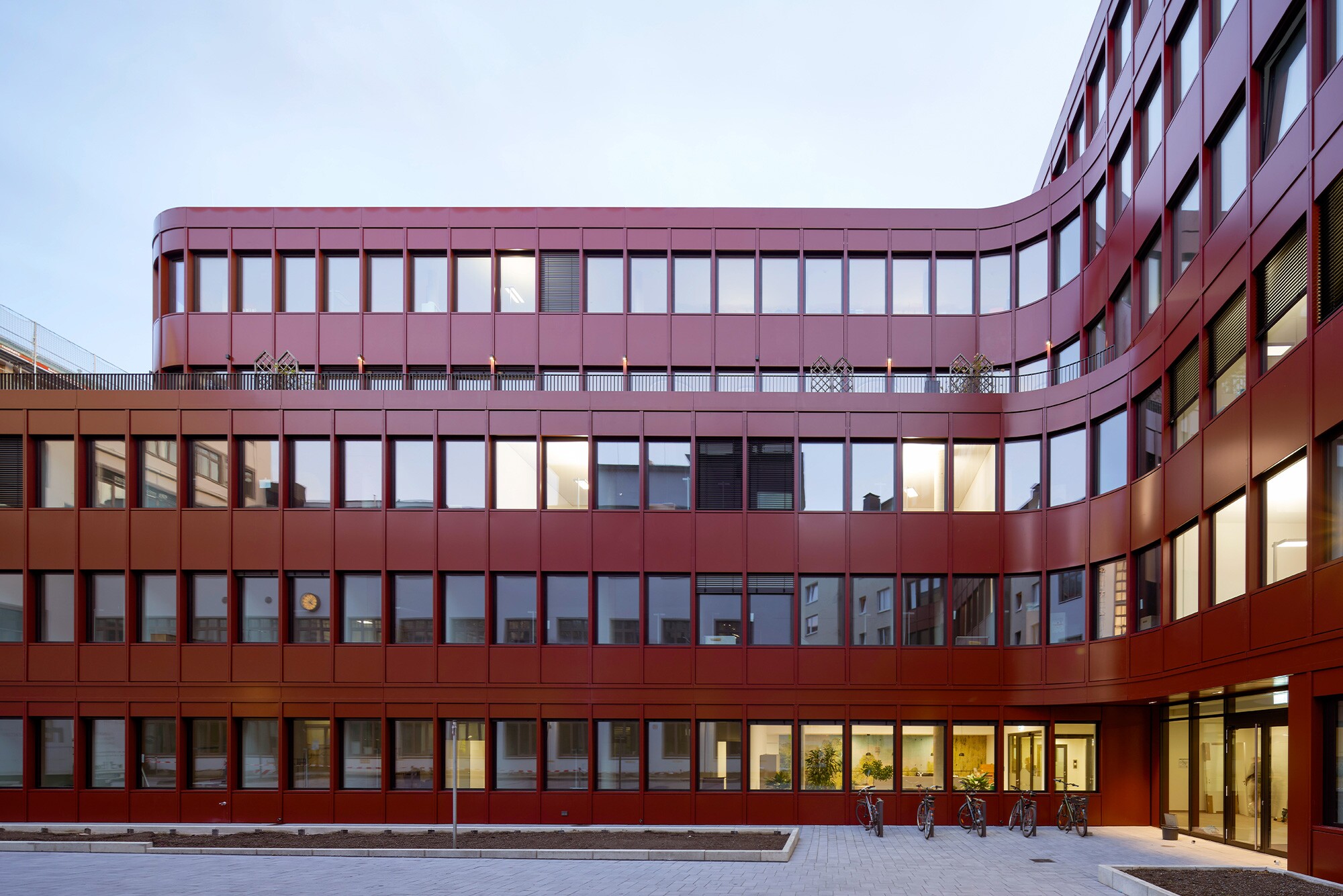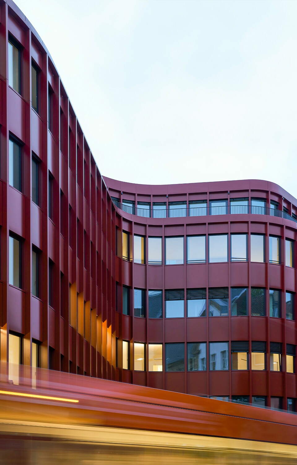 Der Büroneubau CURVE schließt das rund 4.136 m² große Baufeld zwischen Helmholtz-, Luisen- und Scheurenstraße in unmittelbarer Nähe des Düsseldorfer Hauptbahnhofs. Mit seiner markant geschwungenen, leuchtend roten Fassade hebt sich das Gebäude deutlich von der umliegenden Bebauung ab. Der dynamische, kreuzförmige Grundriss ermöglicht eine Erweiterung des Baukörpers in den Blockinnenbereich. Auf sechs Geschossen entstanden moderne, flexibel nutzbare Büroflächen mit insgesamt 10.800 m².