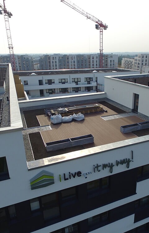 In Europas größter Passivhaussiedlung, dem Stadtteil Bahnstadt in Heidelberg, haben wir auf einer Fläche von 5.410 m² ein Gebäude mit insgesamt 370 Appartements für studentisches und temporäres Wohnen in Passiv[-]hausbauweise mit 5 bis 6 Obergeschossen auf einer Tiefgarage mit 117 Stellplätzen errichtet.