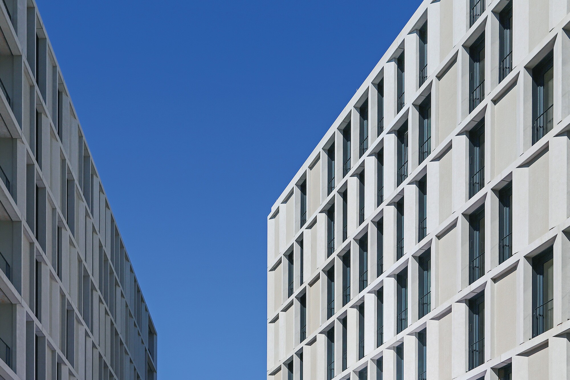 An einem Ort mit Ausblick auf die Breisgauer Bucht, auf Freiburg und auf die Hänge des Schwarzwalds erhebt sich das polygonale Gebäude mit einem 2-geschossigen Sockel und 2 aufgesetzten 6-geschossigen Türmen. Neben einer Tiefgarage und Parkflächen im Erdgeschoss stehen im 1. OG Büroflächen zur Eigennutzung der Firma Schleith zur Verfügung. Die darüberliegenden Gebäude beherbergen hochwertige Wohnungen mit großzügigen Loggien. Schmale Gesimse und Stützenbekleidungen mit versetzt angeordneten opaken Bauteilen bilden die filigrane Struktur der Fassade. Ökonomische Aspekte führten zu einer Zusammenfassung der einzelnen Elemente – unter Beibehaltung des architektonischen Entwurfs. Verfügen die erhabenen Stützen und Gesimse über eine gestrahlte Oberfläche, sind die tiefer liegenden geschlossenen Felder gewaschen. Die Farbigkeit besteht aus einem Grauton mit einem leichten Beigeeinschlag. 374 Vorhangfassadenelemente in Form von “Kämmen“ kamen zur Ausführung.