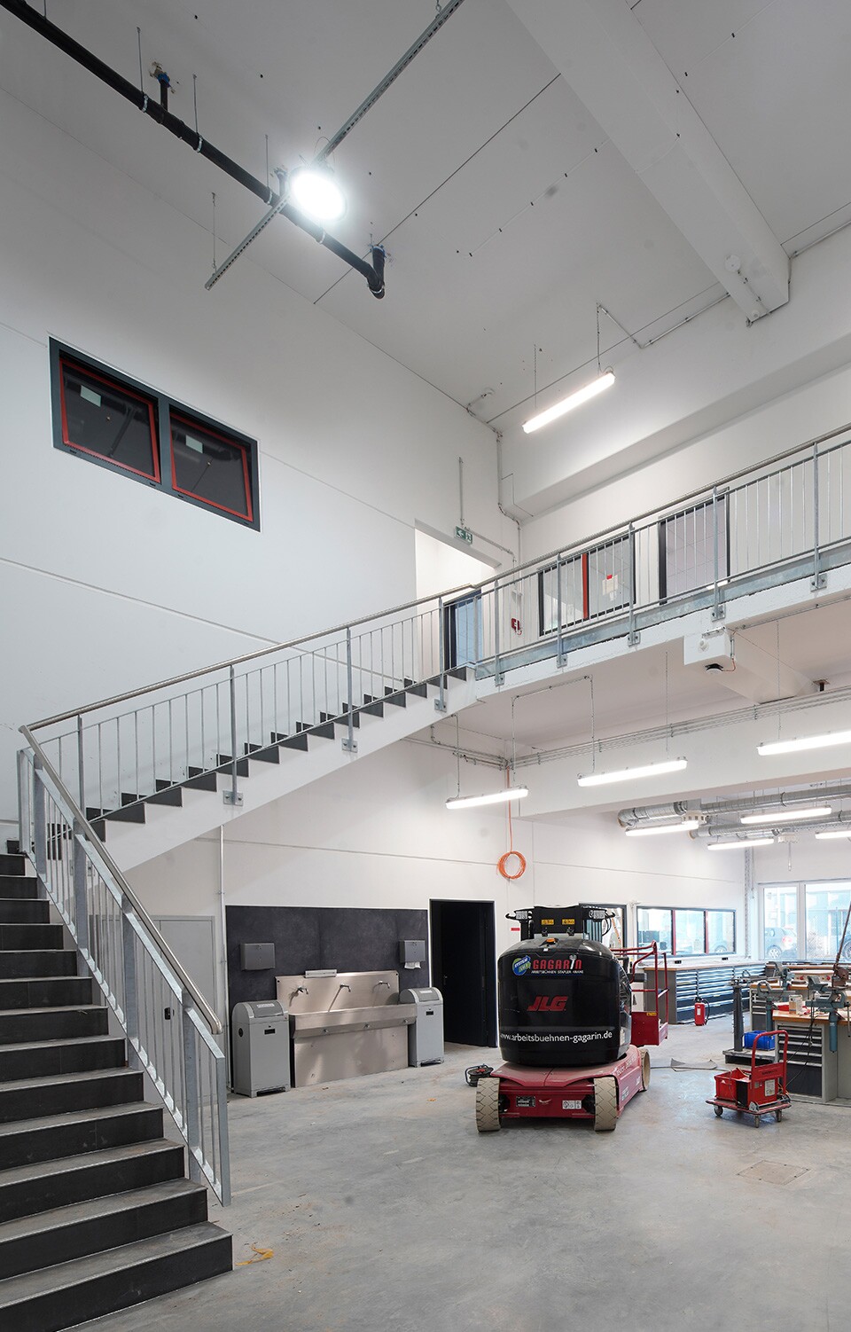 Im Erdgeschoss entstanden Büro- und Sanitärbereiche sowie eine mechanische Werkstatt mit Krananlage, die für Metallbearbeitung und Reparaturen sowie als Ausbildungsstätte genutzt wird. Ergänzend wird ein Ersatzteillager mit Lagerliftsystemen realisiert, die bis zur UK-Decke des 2. Obergeschosses reichen. Weitere Funktionsräume wie Öllager, Waschplatz, Staplerwerkstatt, Technische Rettung und ein Malerraum sind ebenfalls integriert. Das 1. Obergeschoss dient der Unterbringung technischer Anlagen sowie zusätzlicher Lager- und Archivflächen. Im 2. Obergeschoss entstehen Büro-, Konferenz-, Sanitär-, Umkleide- und Aufenthaltsräume.