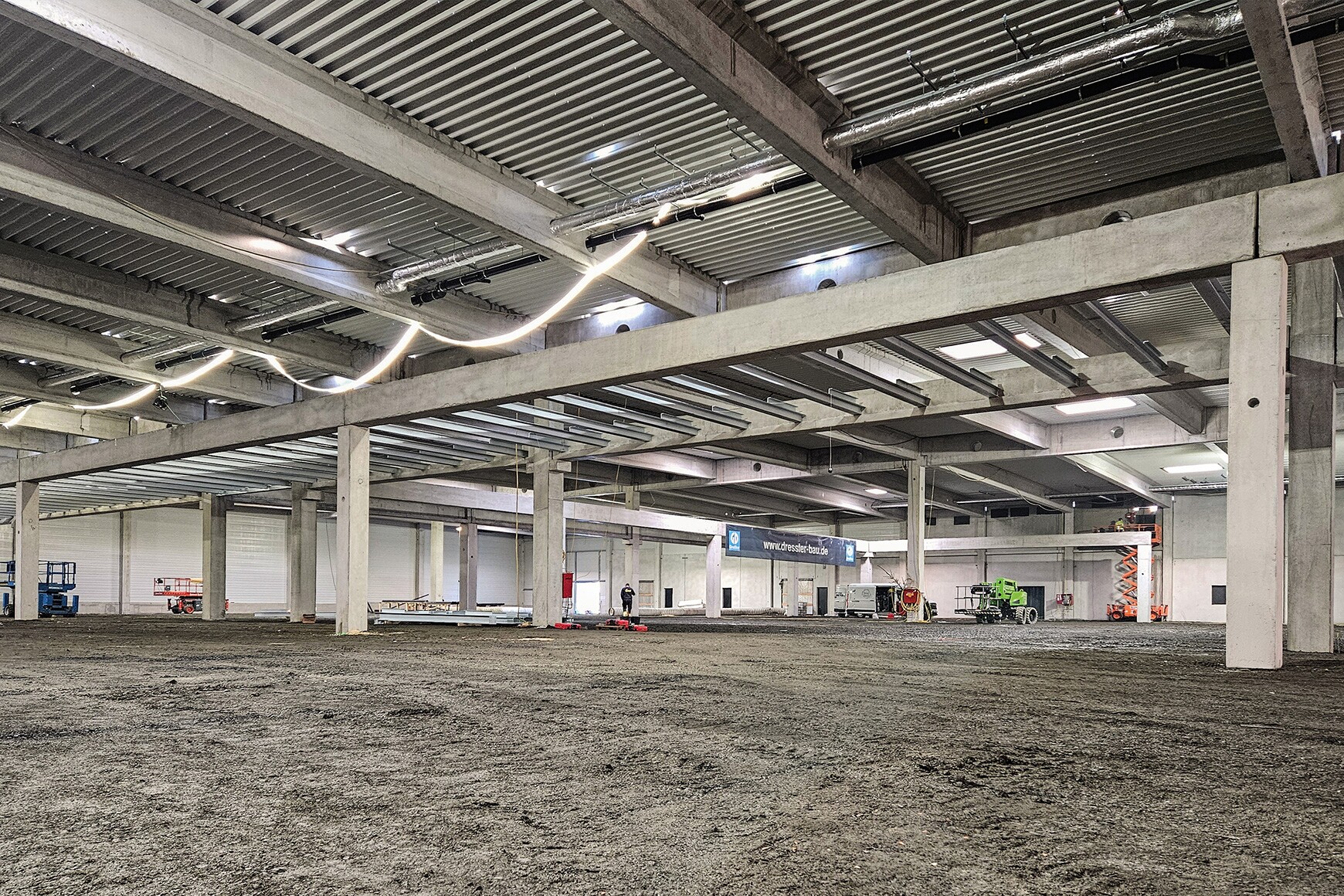 Zentrale Herausforderung ist die termingerechte Bereitstellung der umfangreichen Haustechnik für verbindliche Early Access Termine. Bereits im ersten Ausbauschritt werden 1.500 kW Maschinenkühlung, 4.000 kW Trafoleistung, 120.000 m³/h Lüftung sowie Druckluft-, Sprinkler- und Brandmeldeanlagen installiert. Im Endausbau wächst die Technik auf 2.500 kW Kälte-, 8.000 kW Trafo- und 240.000 m³/h Lüftungsleistung. Zur strukturierten Medienverteilung dient eine 170 m lange, 6 m breite Stahlbühne als durchgehende Installationsebene.