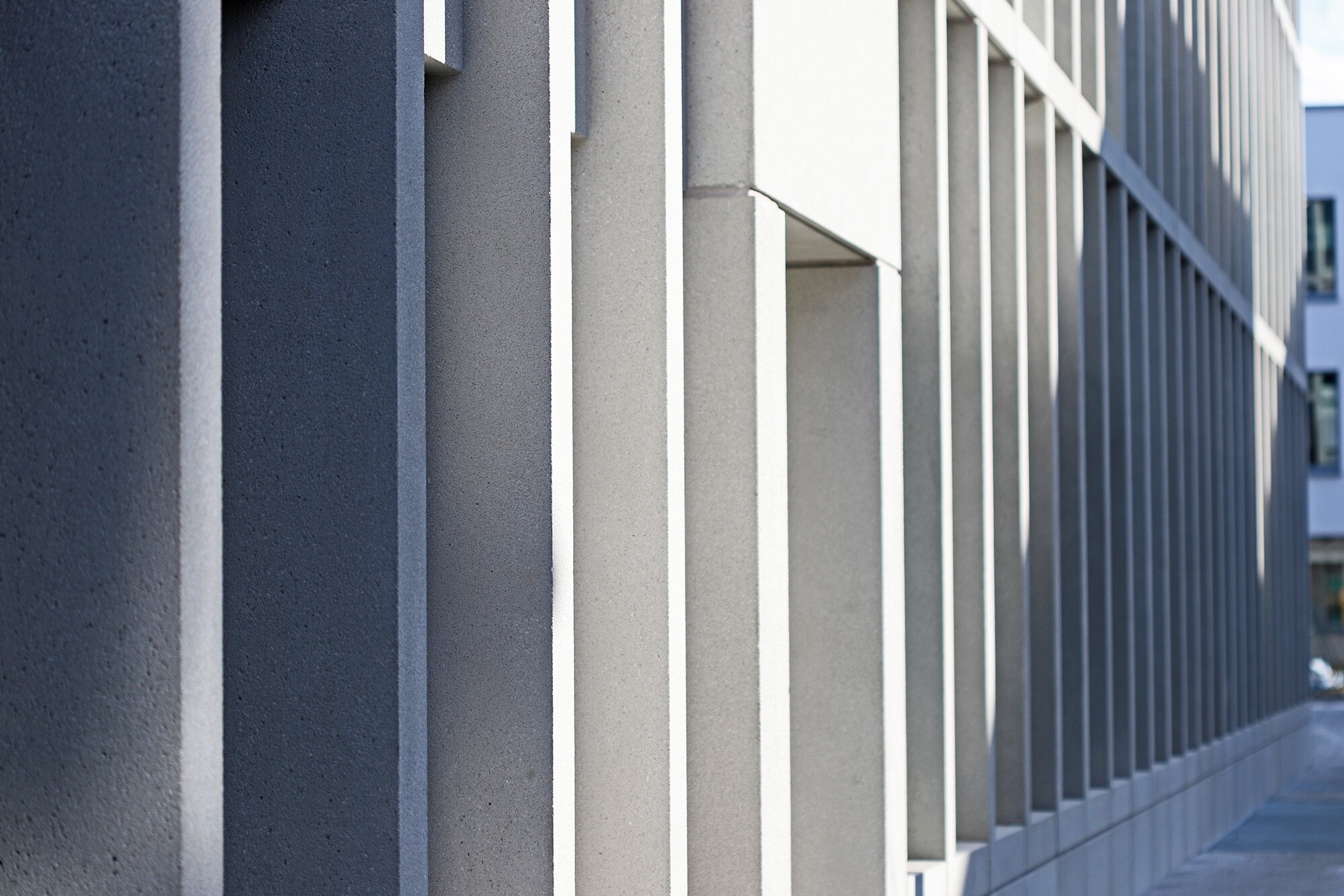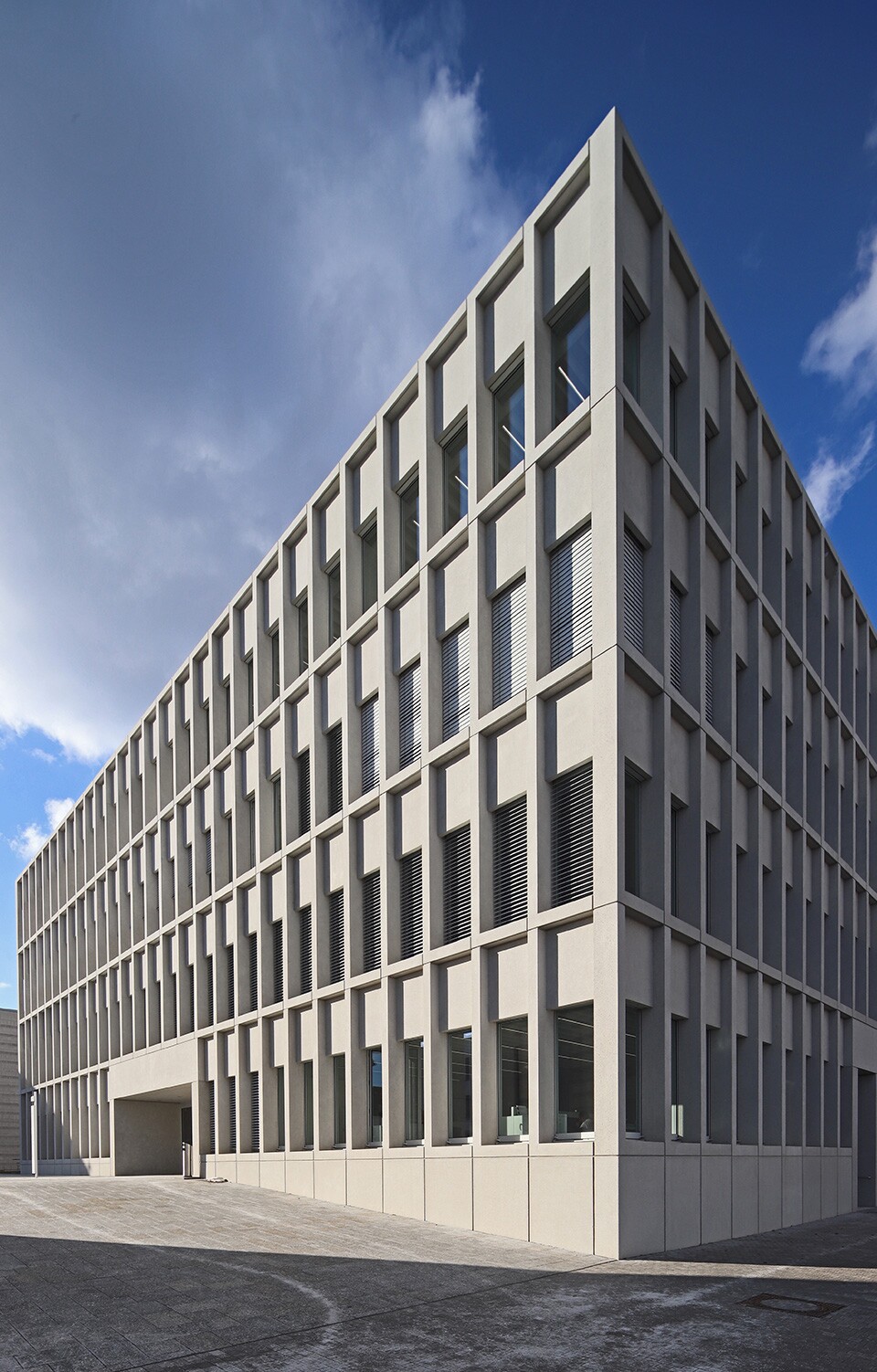 Nach dem großen Stadtbrand im November 1801, bei dem die mittelalterliche Oberamtsstadt fast vollständig niederbrannte, erbaute der württembergische Landbaumeister Carl Leonard von Uber (*18.02.1768; †15.08.1834) das moderne Tuttlingen als vollständig neue klassizistische Planstadt. Im Sinne des Landbaumeisters geht der kubische Baukörper auf den klassizistischen Grundriss der Stadt ein. 472 Fassadenelemente aus hellgrauem Architekturbeton mit tiefgestrahlter Oberfläche setzen sich zu einer klar strukturierten Gebäudehülle zusammen. Um stützenfreie Grundrisse und offene, ununterbrochene Raumstrukturen zu schaffen, wurden die Stützen nach außen verlagert und über Isokörbe mit den Geschossdecken verbunden.