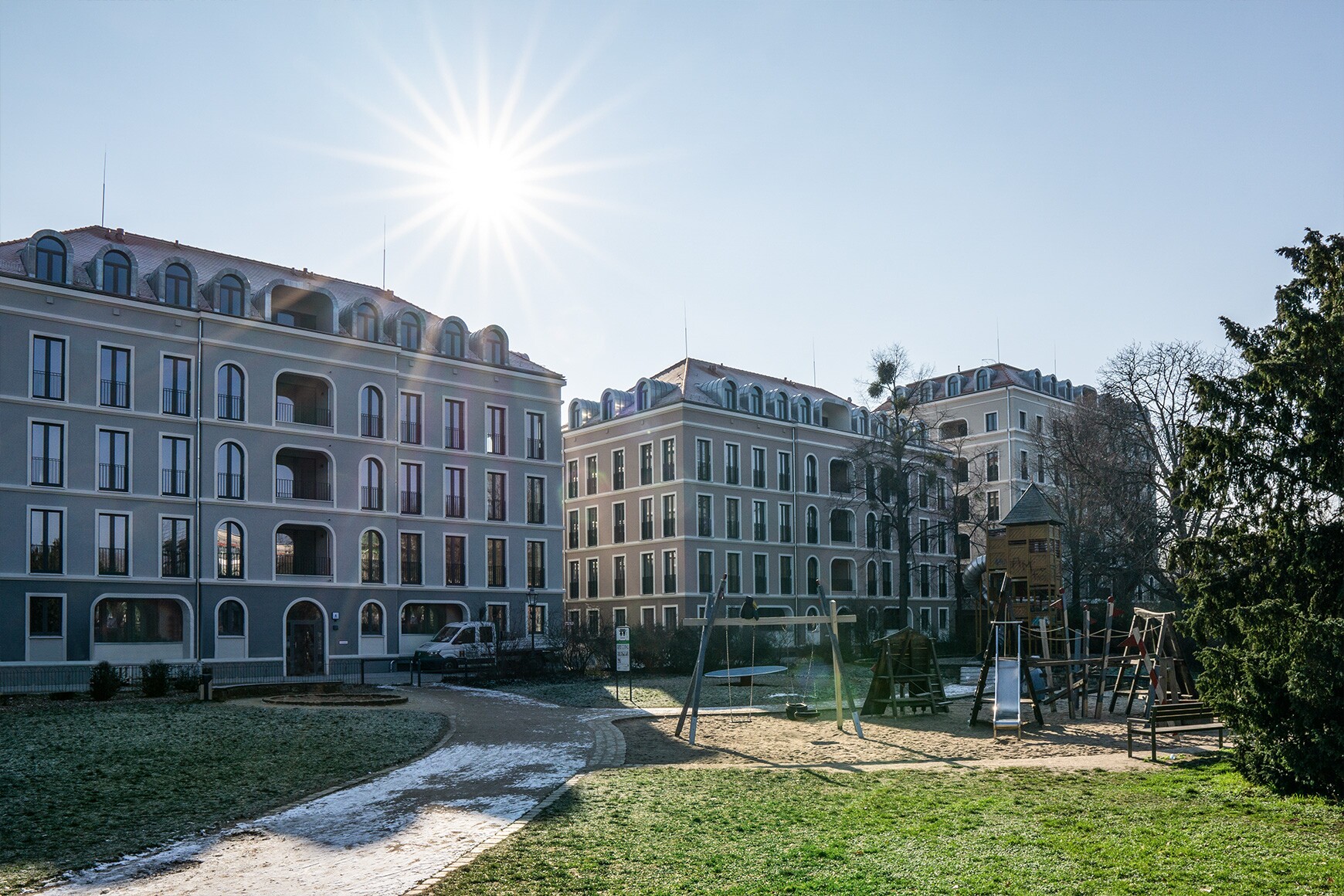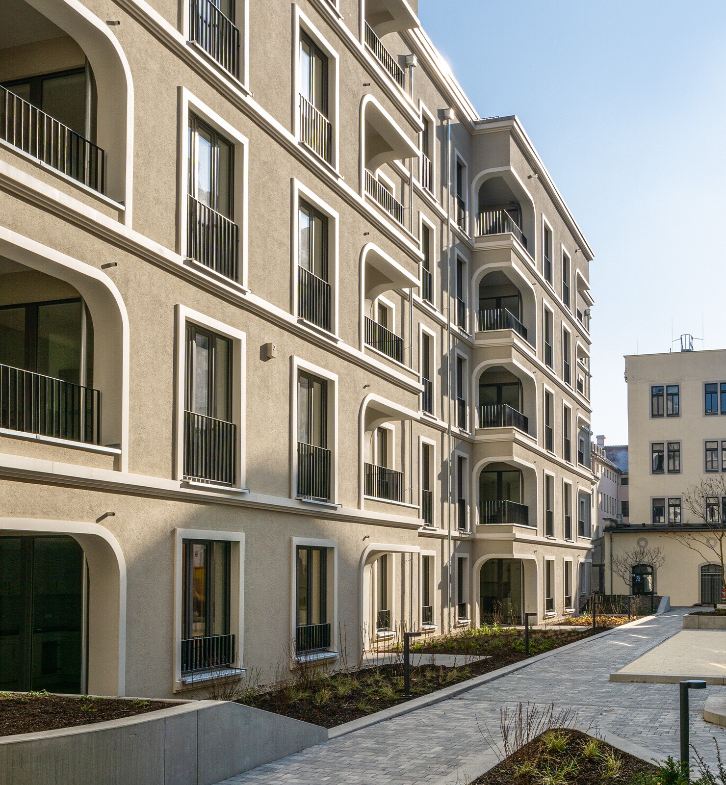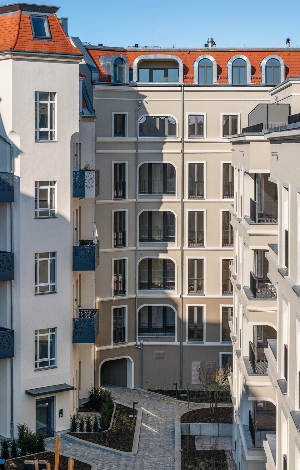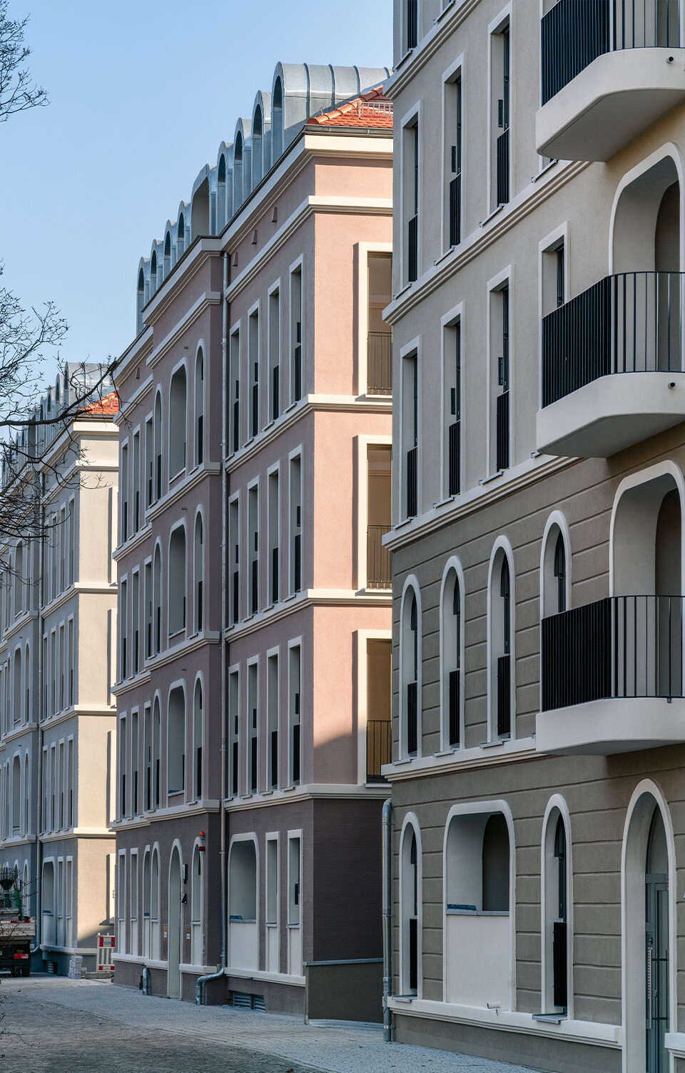 Die Königshöfe Dresden kombinieren moderne Bau prozesse, Materialien und Formgebung mit barocken Elementen. Trotz stellenweise fast 300 Jahren Altersunterschied fügen sie sich geradezu symbiotisch in die Nachbarbebauung ein. Zum Auftrag gehörte die schlüsselfertige Errichtung der 192 Wohnungen samt zweigeschossiger Tiefgarage.