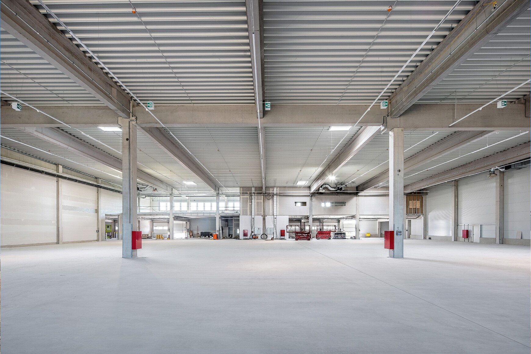 Auf rund 7.500 m² entstanden flexible Lager- und Büroflächen, die sich in bis zu vier Einheiten mit eigenen Technikbereichen, separaten Eingängen sowie individuellen Brand-, Schall- und Energiesystemen aufteilen lassen. Die Mezzanine kann variabel als Büro- oder Lagerfläche genutzt werden; selbst Lagerbereiche sind später problemlos in Büroflächen umwandelbar.