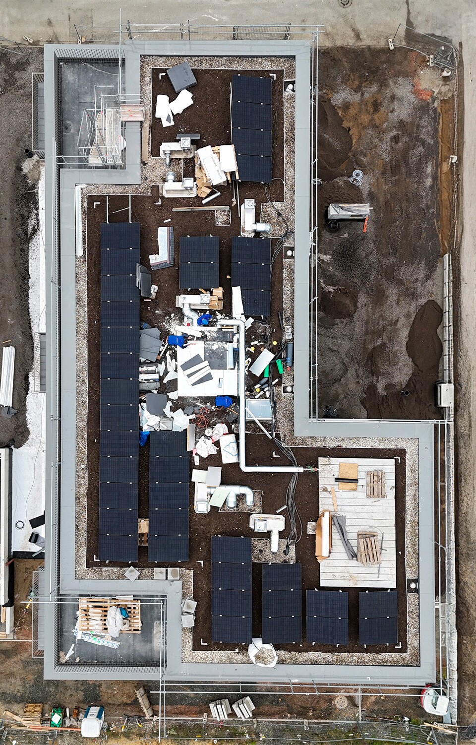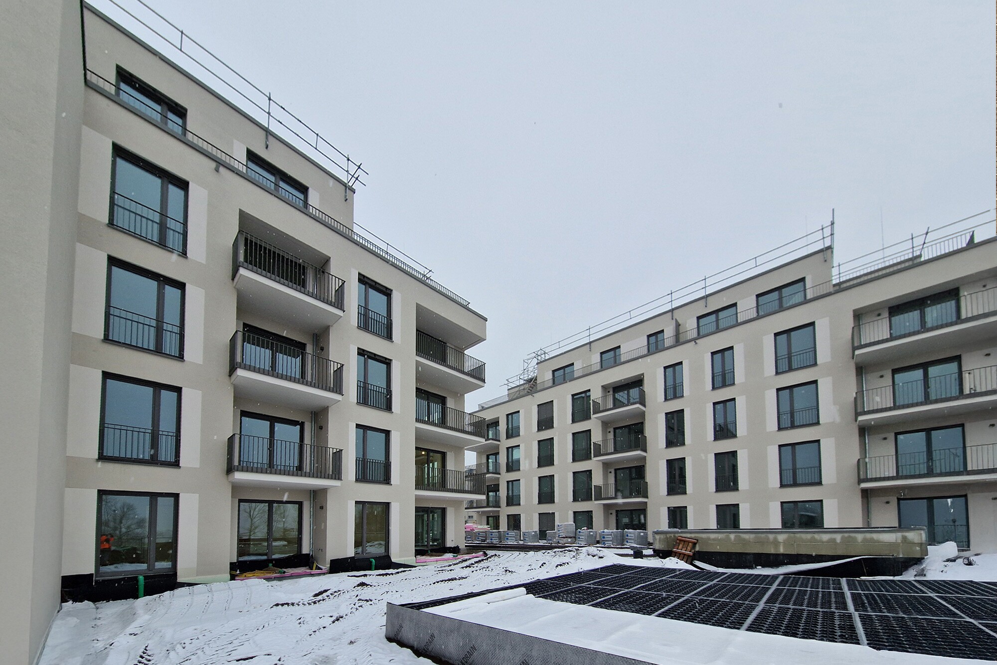Auf dem ehemaligen Gelände der Hessenglasfabrik AG in Oberursel entsteht ein neues Wohn- und Gewerbequartier. Die Niederlassung Aschaffenburg errichtet dort bis Ende März 2026 zwei Wohngebäude mit je 18 Wohnungen in fünf Geschossen, verbunden durch eine gemeinsame Tiefgarage. In „Haus A“ entstehen 16 geförderte Wohnungen sowie zwei Eigentumswohnungen im Staffelgeschoss. Alle 18 Wohnungen in „Haus B“ sind Eigentumswohnungen, teilweise bereits während der Bauzeit verkauft. Die Grundrisse umfassen 2- bis 4-Zimmer-Wohnungen, teils mit zwei Bädern. Beide Gebäude werden im KfW‑55‑Standard mit Photovoltaikanlage ausgeführt. Die BGF liegt bei ca. 6.180 m²; die Wohnfläche bei ca. 2.130 m². Die Fassaden entstehen als WDVS-Konstruktion mit 3-fach-verglasten Kunststofffenstern. Die Belüftung erfolgt über Rollladen- bzw. Leibungslüfter, die Abluft über feuchtegesteuerte Elemente in Bädern und Küchen. Die Beheizung übernehmen Dachwärmepumpen, das Warmwasser wird zusätzlich über Booster-Wärmepumpen im Keller erhitzt. Alle haustechnischen Anlagen sind vollständig getrennt und auf die spätere Realteilung vorbereitet. Die gemeinsame Tiefgarage mit 35 Stellplätzen wurde in WU-Beton ausgeführt. Die nicht überbaute Garagendecke wird nach dem Schwammstadtprinzip als Retentionsfläche gestaltet, die Entwässerung erfolgt direkt in den Urselbach.