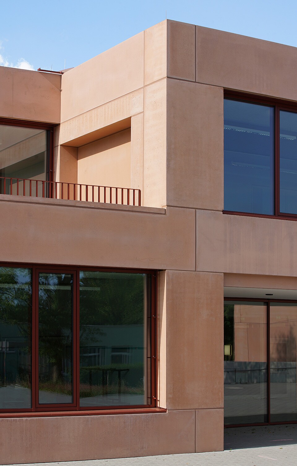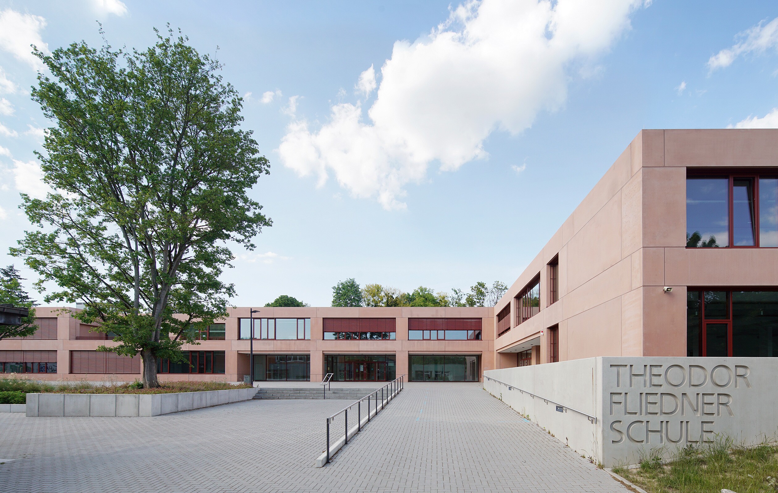 Der zweigeschossige, L-förmige Schulneubau liegt wie ein rötlichbrauner Monolith am nördlichen Ortsrand des Wiesbadener Vorortes Bierstadt. Er übernimmt gemäß seiner Vorbildwirkung und als Ort der Bewusstseinsbildung eine aktive Rolle im Bereich des Klimaschutzes und wird über die Lichthöfe und Atrien natürlich belichtet. Die großflächigen Fensterelemente werden von ca. 300 vorgehängten Betontafeln mit glatter Oberfläche und scharfkantiger Ausbildung umrahmt. Laibungen mit nahezu 40 cm Tiefe und Eckelemente mit 135 cm langen, angeformten Schenkeln unterstreichen die Massivität des Baukörpers.