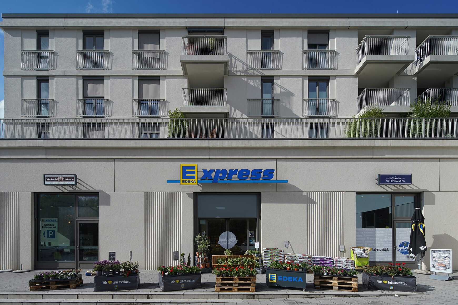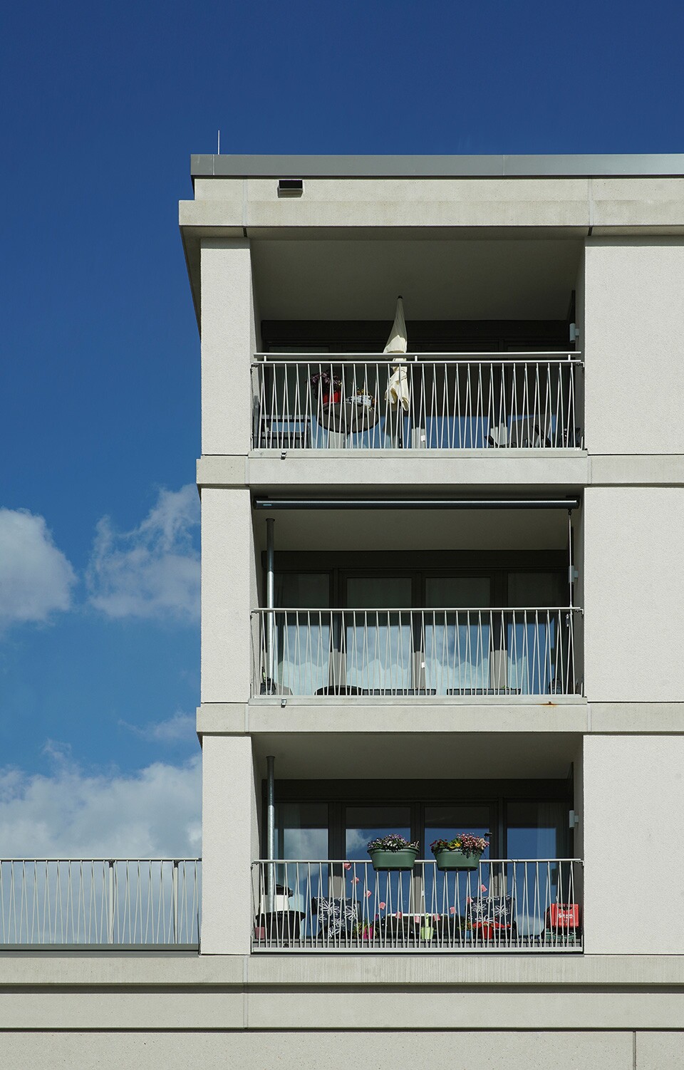 Im historischen Bezirk Altperlbach im Südosten Münchens entstand ein neues Wohngebiet mit einem viergeschossigen Baukörper, dessen Fassaden Putz- und Sichtbetonflächen mit raumhohen Fenstern kombinieren. Die im Sockelbereich ausgeführte Fassade aus zementgrauen Betonfertigteilen mit gestrahlter Oberfläche wird in Form von geschossweise umlaufenden Gesimsbändern und als Attika fortgeführt. Obwohl die Bänder nur 36 cm hoch sind, konnten sie, trotz ihrer Kopflastigkeit, mit Hängezugankern wirtschaftlich montiert werden. Die Vorhangfassaden im EG erhielten in Teilbereichen senkrechte Auskehlungen, ähnlich der Kannelierung an griechischen Säulen. Insgesamt kamen knapp 200 Architekturbetonelemente zur Ausführung.
