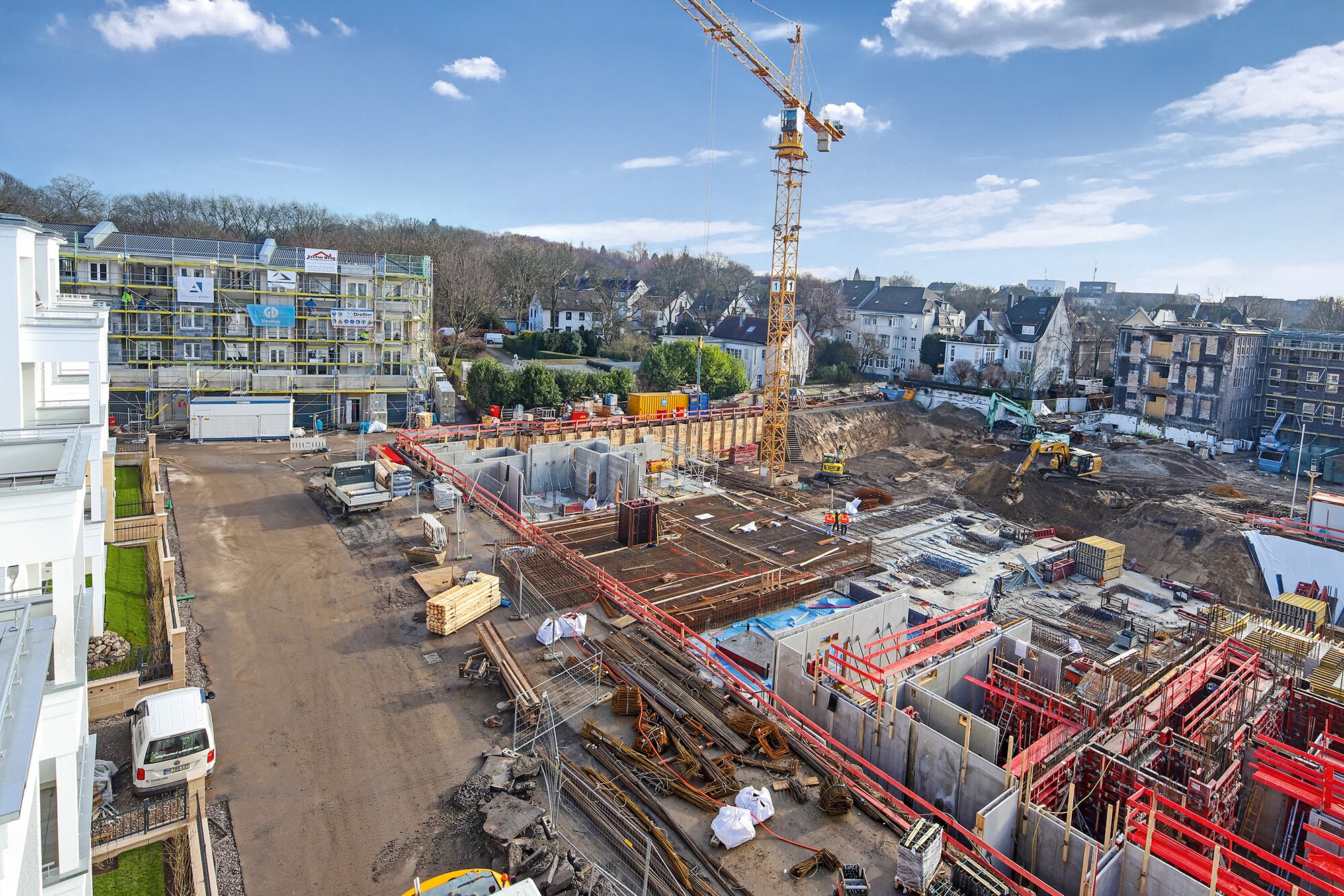 Die Fassaden des neuen Dichterviertels sind an den Stil der Altbaufassaden der umliegenden Häuser angelehnt. Mit Sprossenfenstern, Gesimsen und Faschen sowie Mansardendächern fügt es sich nahtlos in die Umgebung ein. Dreßler Bau hat den erweiterten Rohbau inkl. der Entwässerungsarbeiten unter- und außerhalb des Gebäudes ausgeführt. Der Standort in einer ehemaligen Bergbauregion machte es erforderlich, das Untergeschoss als WU-Konstruktion zu erstellen, um die Gasdichtheit gegen evtl. austretendes Methangas sicherzustellen. In 10 Gebäudekörpern entstanden 84 Miet- und 28 Eigentumswohnungen, 6 Townhouses sowie 101 TG-Stellplätze. Aufgrund von Höhenversprüngen der Decke innerhalb der zweigeschossigen TG ergaben sich Unterzüge von bis zu 3 m Höhe und Raumhöhen im Bereich der Unterzüge bis zu 6 m. Die Kelleraußenwände und alle Decken ab EG wurden als Halbfertigteile errichtet, bei den Wänden kam teilweise Mauerwerk zur Ausführung. Im DG wurden Stahlbetonfertigteilwände von bis zu 5 m Höhe erstellt, die an vielen Stellen dem Verlauf des Mansardendaches folgen mussten. Dadurch waren die Wände trapezförmig, was mit einem erhöhten Schalungsaufwand verbunden war.